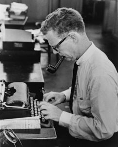 Edwin Rodman Serling arbeitete ebenfalls mit einer Royal KMM Schreibmaschine. Der amerikanische Drehbuchautor, Dramatiker, Filmproduzent und Moderator wurde vor allem durch die seine Kreation der Kultserie „Twilight Zone“ bekannt.