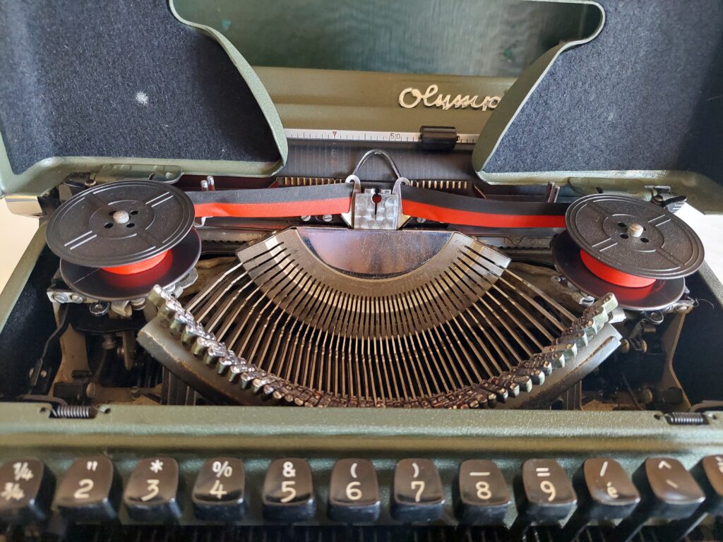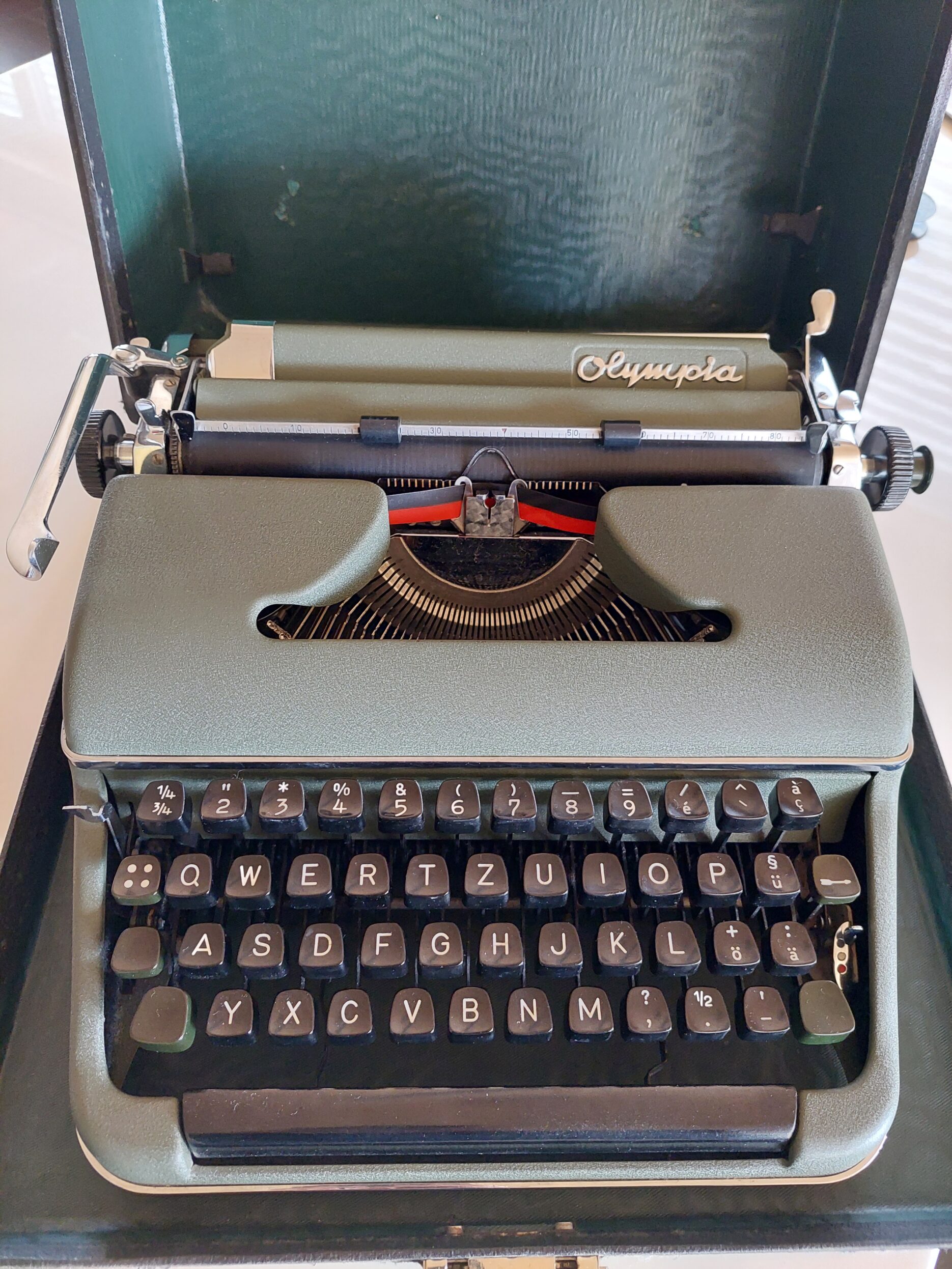 Die Schreibmaschine des Typs Olympia SM 2 wurde von 1950-1961 vom grössten Schreibmaschinenhersteller Olympia im deutschen Wilhelmshaven produziert. Für meinen Vater war sie das erste technische Schreibgerät. Die Maschine wurde in einem eingefassten Holzkoffer geliefert in welchem die Maschine über zwei Klinkmechanismen am Boden festgemacht werden kann. Somit ist sie gut vor Transportschäden geschützt.