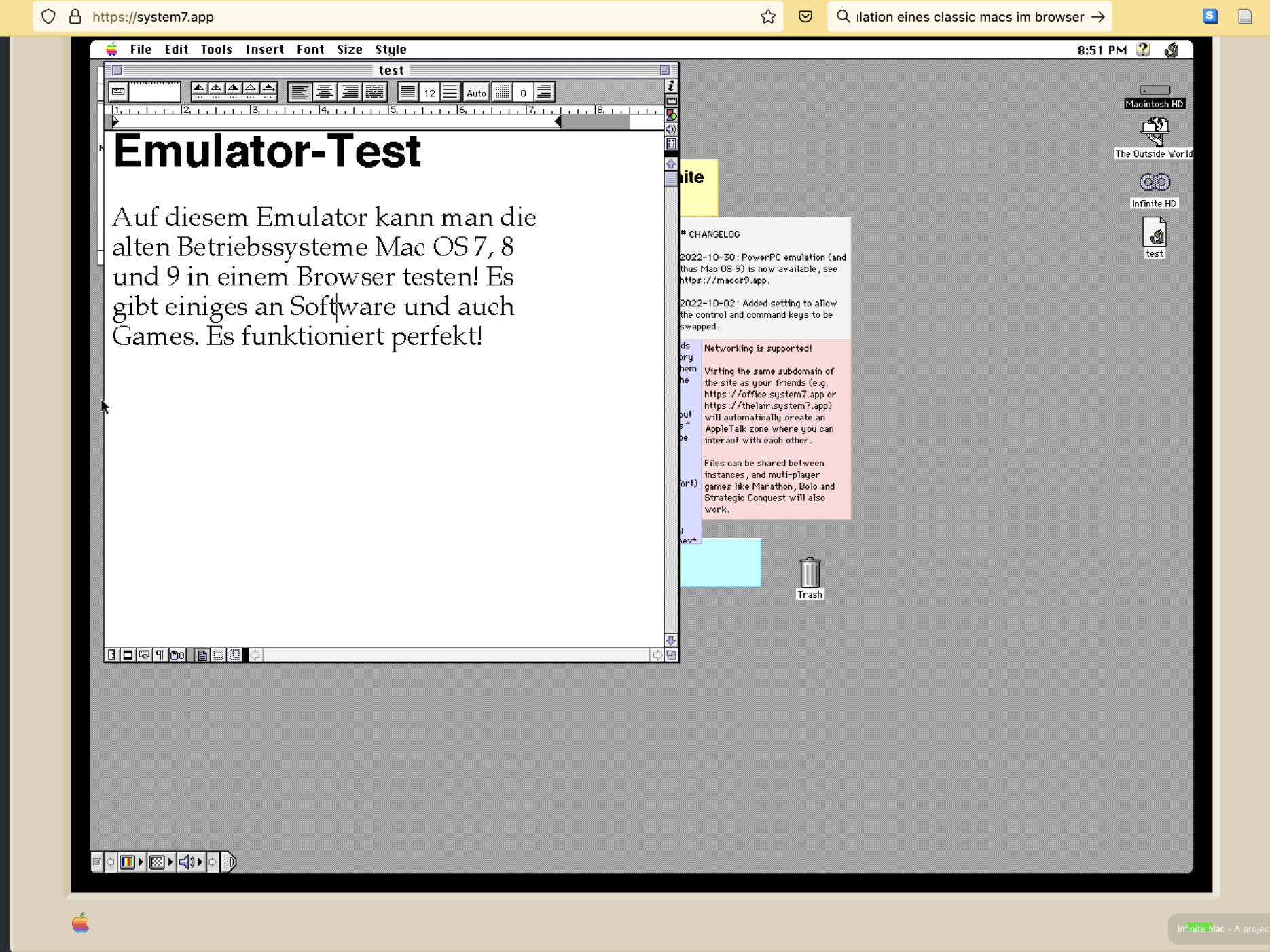 Es ist nun sogar möglich, in einem Browser einen solchen Emulator laufen zu lassen. So ist es möglich, die alten Mac-Betriebssysteme 7, 8 und 9 im Browser laufen zu lassen und so auch alte Software auszuprobieren. Hier die Links zu den Emulatoren: